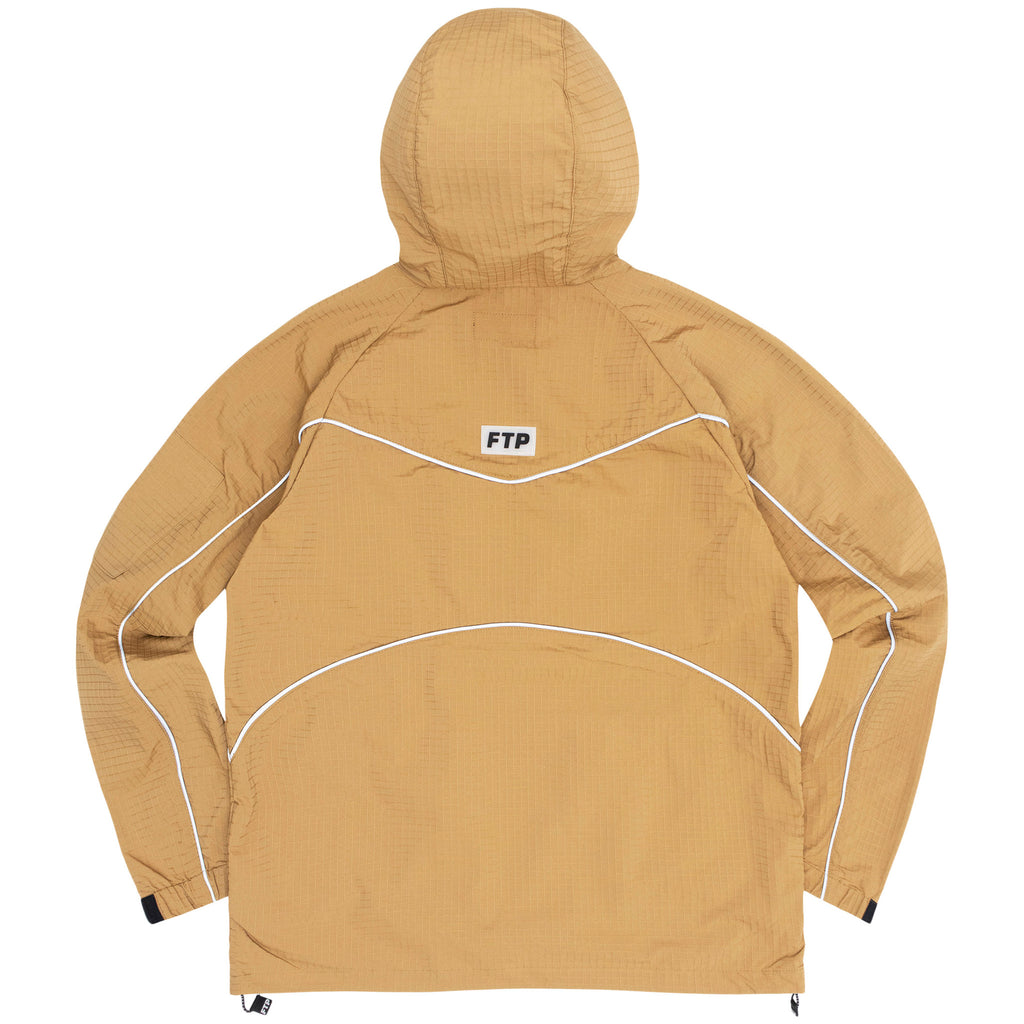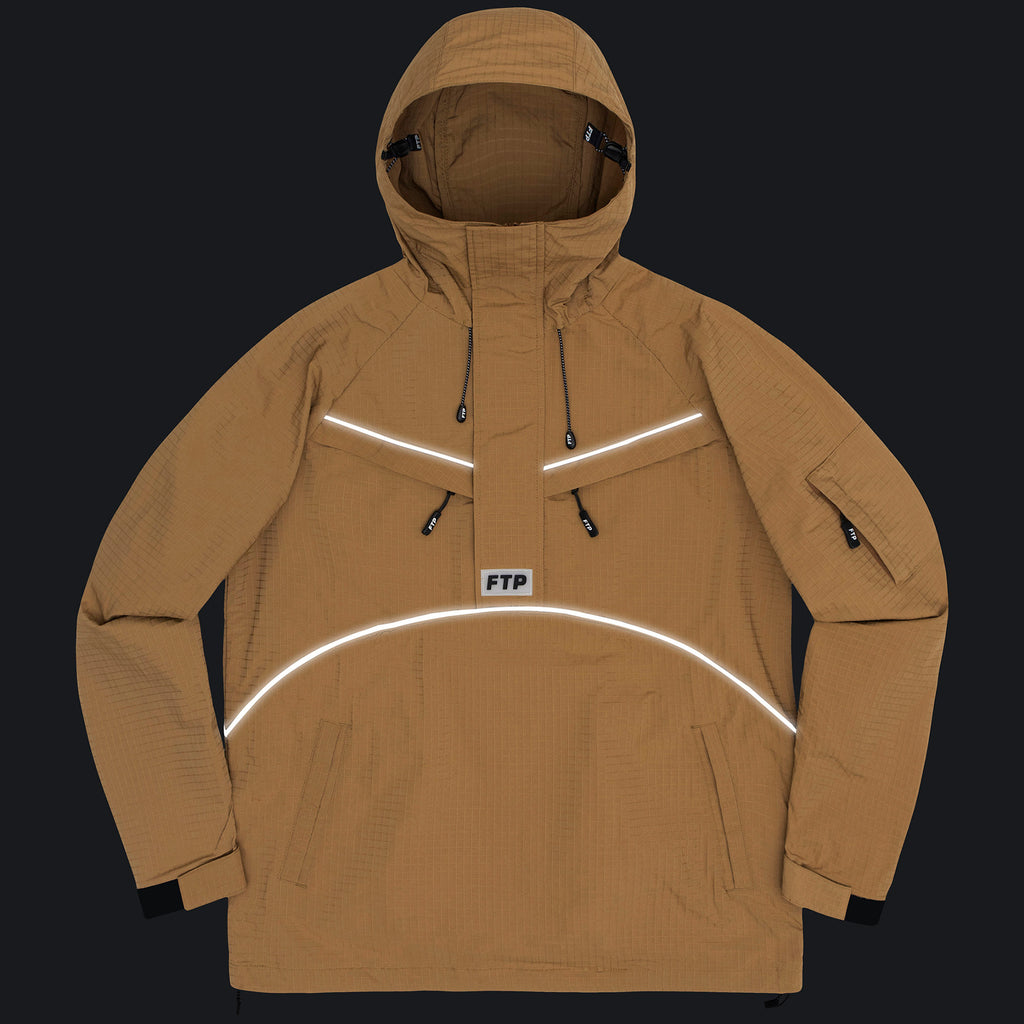 HEAVY RIP STOP POLYESTER ANORAK WITH TRANSLUCENT FTP RUBBER LOGO PATCH ON FRONT, REFLECTIVE PIPING ON FRONT, BACK, AND SLEEVES, FRONT CHEST AND SLEEVE CARGO POCKETS, AND CUSTOM FTP BRANDED ZIPPER PULLS AND BUNGEE HOOD ADJUSTERS.